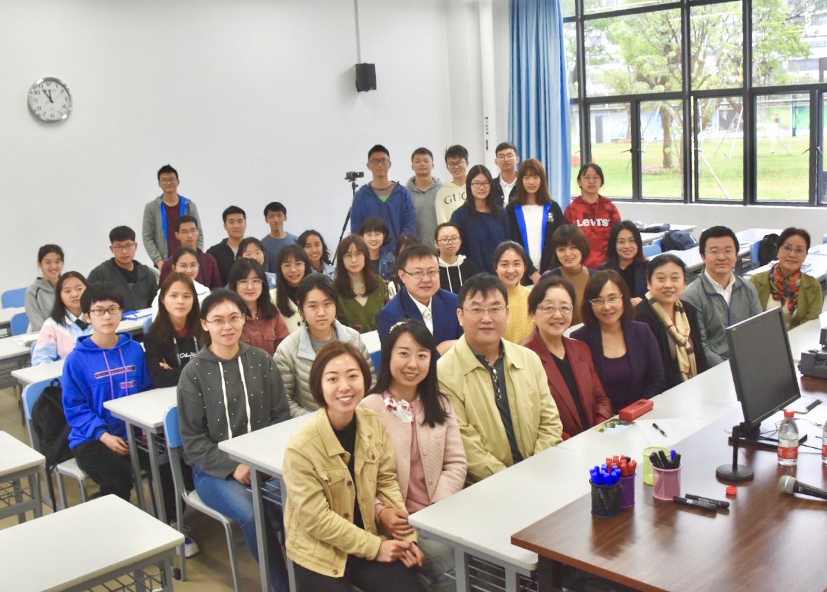 在示范课结束后,凌教授收到来自我院第一届学生联名赠送的贺卡及纪念品,并与我院师生们一起合影留念,同学们也对凌教授的下次来访表示期待。
