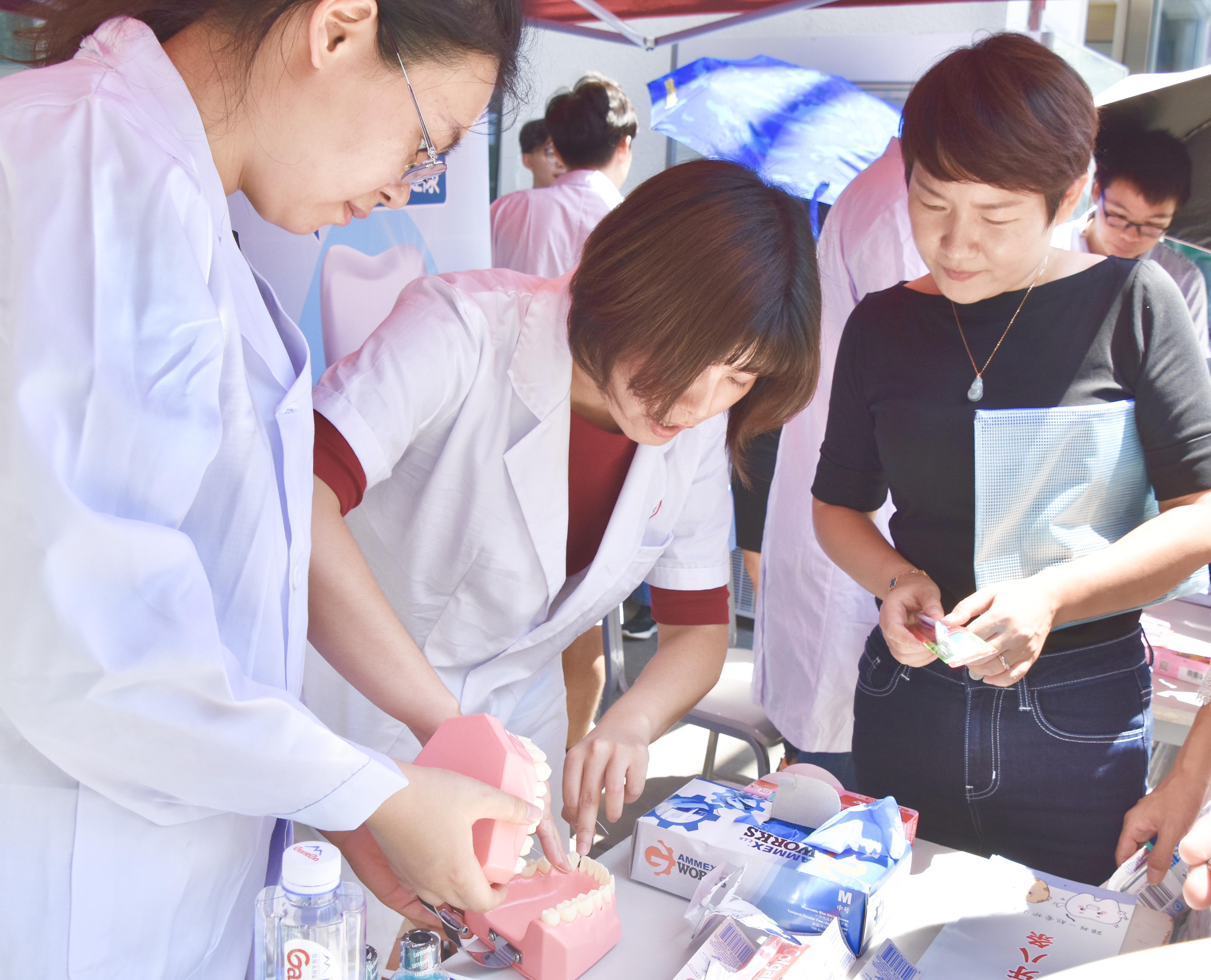 我院教师及部分口腔医学专业一、二年级本科生参加了当天的活动。活动伊始,前来咨询的师生便络绎不绝,我院教师利用口腔模型示范正确的刷牙和牙线使用方法,并运用他们资深的临床与教学经验为前来咨询的师生们提供相应的个性化口腔健康保健建议,参加活动的口腔医学生们也积极宣传,提高大家对全国爱牙日和口腔健康的关注。