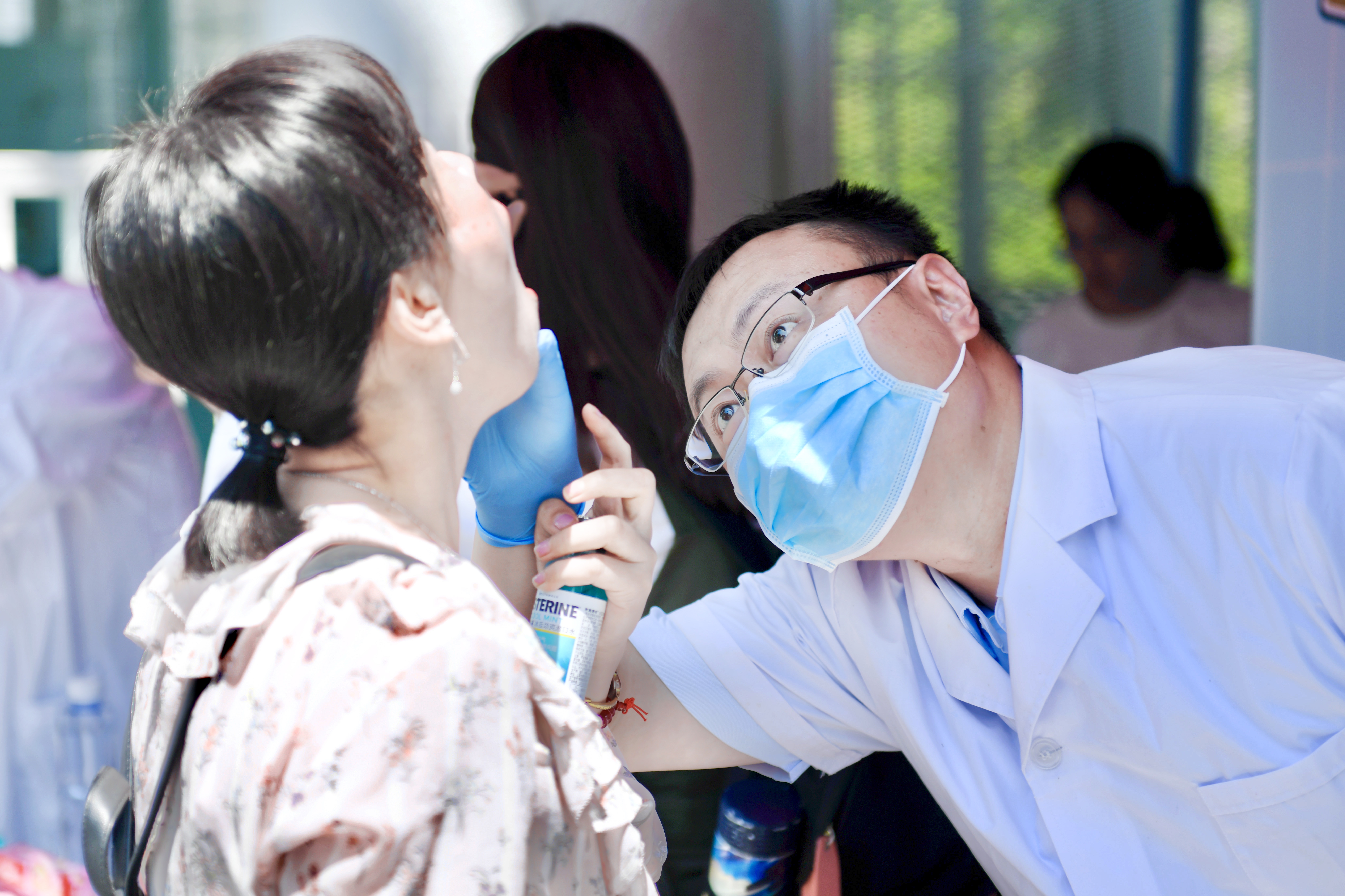 我院助理教授姜炜鹏在现场为咨询者检查牙齿