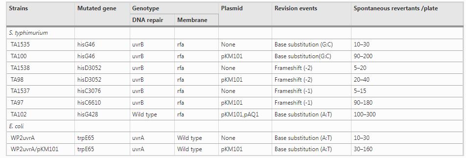 All Salmonella strains used for this test carry a mutation in a gene (hisG; hisD) that encodes an enzyme involved in histidine biosynthesis, thus inhibiting the growth of these strains on media that do not contain histidine (histidine requirement). However, another mutation in the relevant gene caused by a chemical allows the synthesis of histidine and formation of colonies by these strains on media that do not contain histidine (histidine non-requirement). As this involves the reversion of the phenotype of the bacterial strain from histidine requirement to histidine non-requirement, it is termed a reverse mutation test. This test may be performed to detect several mutations, because reversion of the phenotype may result not only from re-mutation of the original mutation site, but also from a mutation around this site or in a tRNA gene. The Salmonella strains involved in the Ames test include TA1535, TA100, and TA102 and are used to detect base substitution mutations; additionally, the strains TA1538, TA98, TA1537, and TA97 are used to detect frameshift mutations. All such bacterial strains are highly permeable to chemicals due to a lack of ability to biosynthesise cell wall lipopolysaccharides. Furthermore, all strains, except TA102, display higher sensitivity to mutagens due to deletion of uvrB, an important genetic element which regulates nucleotide excision repair. Furthermore, TA97, TA98, TA100, and TA102 harbour the pKM101 plasmid that enables efficient conversion of DNA damage into a mutation. In the case of E. coli, the tryptophan-requiring mutant WP2uvrA or WP2uvrA/pKM101 is used. The principle and method of the test are the same as when Salmonella is used, except that the required amino acid is tryptophan instead of histidine. These strains are highly sensitive to mutagens that cause base pair substitution and are also sensitive to UV because of their deficiency in the uvrA gene.