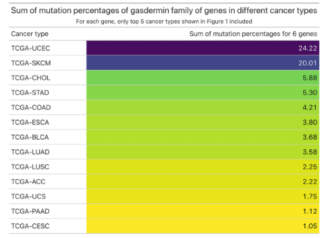 Total percentage of cases affected by mutations in genes encoding gasdermin family of proteins is the highest in uterine corpus endometrial carcinoma (UCEC) among other cancer types