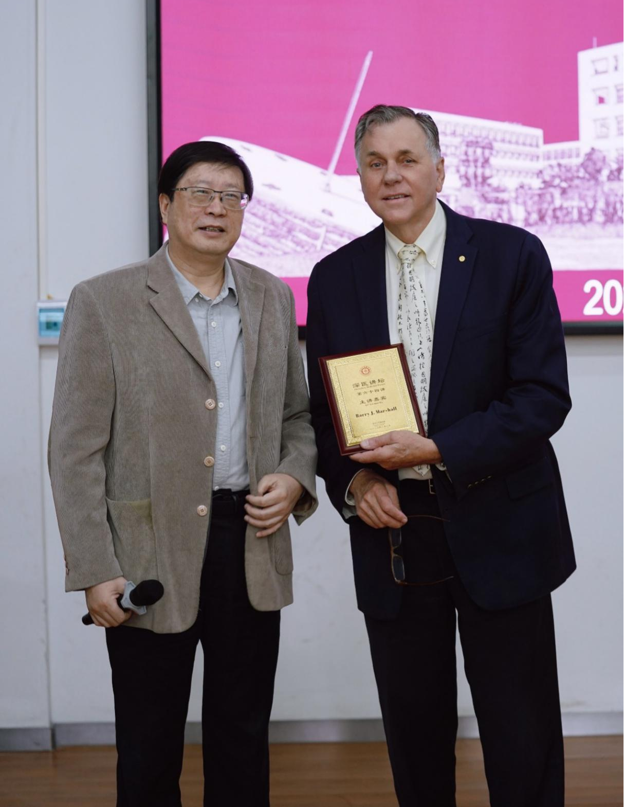 朱卫国教授向主讲嘉宾巴里·马歇尔教授颁发球盟会QMH(中国)官方网站 “深医讲坛”荣誉证书