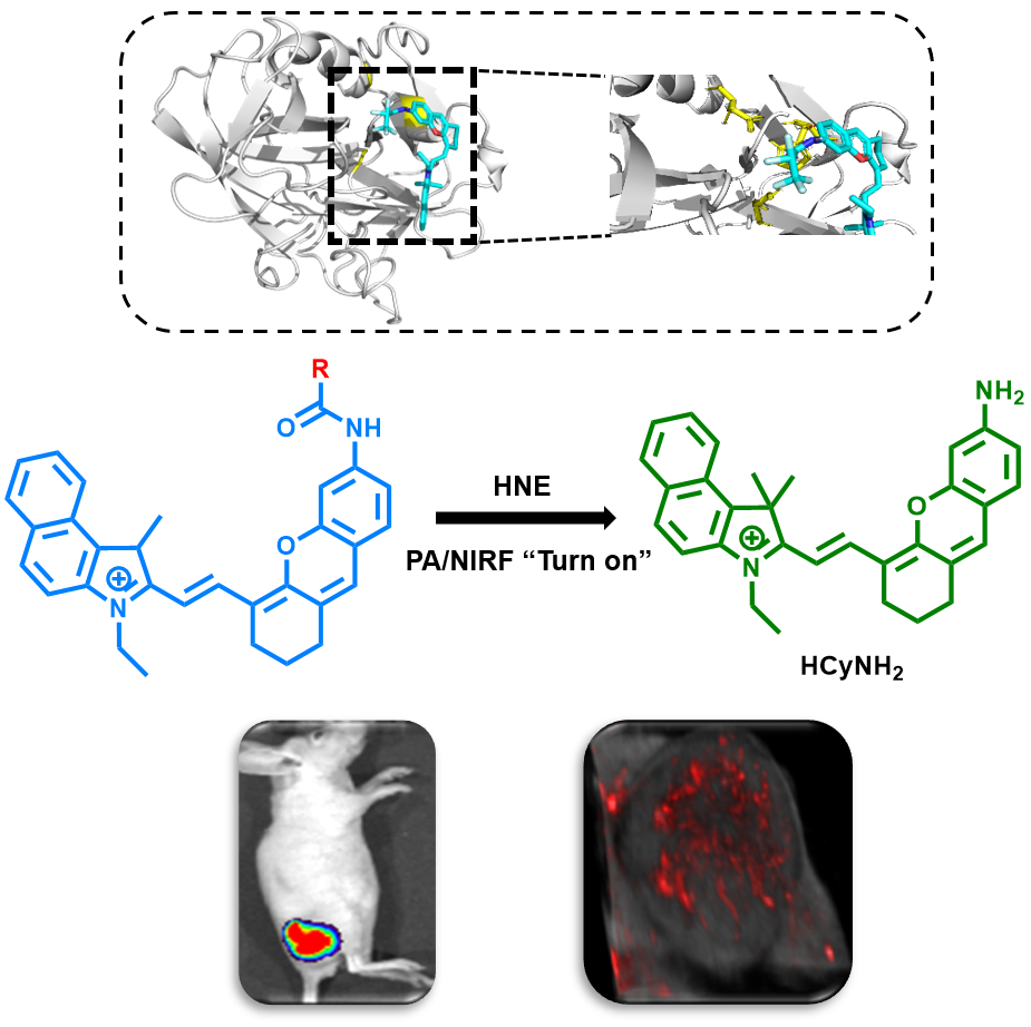此外,该团队在分析化学领域顶级学术期刊《Analytical Chemistry》(影响因子6.986,中科院一区,TOP期刊)上发表了题为《Engineering Molecular Probes for In Vivo Near-Infrared Fluorescence/Photoacoustic Duplex Imaging of Human Neutrophil Elastase》的研究论文,该团队张新明博士后为第一作者,林静教授为唯一通讯作者。该研究报道了一种中性粒细胞弹性蛋白酶(HNE)特异性响应激活的有机小分子探针LET-8,可实现肺癌标志物HNE的活体近红外荧光与光声双模态成像监测。