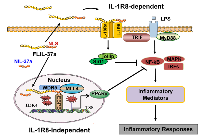 本研究揭示了IL-37a作为新的核细胞因子调控免疫炎症的功能和机制。与其它IL-37亚型不同,IL-37a在其N末端拥有一个NLS序列,通过importin β介导IL-37a进入细胞核,可以结合到PPARγ基因增强子序列促进其转录表达,并通过PPARγ以受体IL-1R8非依赖的形式抑制炎性因子产生。分泌的IL-37a也可以作为细胞因子通过受体IL-1R8依赖的形式发挥其免疫调节功能。这与研究相对较多的另一亚型IL-37b明显不同。该研究为炎症免疫调控以及相关疾病的治疗提供了新思路新方法。