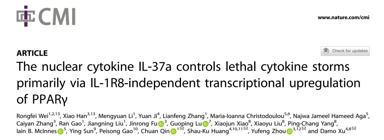 2023年10月27日,深圳大学徐大模/Shau-Ku Huang团队、复旦大学附属儿科医院/生物医学研究院周玉峰团队及中国医学科学院医学实验动物研究所秦川团队在Cellular & Molecular Immunology(IF=24.1)杂志在线发表题为“The nuclear cytokine IL-37a controls lethal cytokine storms primarily via IL-1R8-independent transcriptional upregulation of PPARγ”的研究成果,揭示了IL-37a亚类的生物学特征和功能,特别是可以通过受体IL-1R8依赖和非依赖双重通路, 比IL-37b更有效的抑制致死性细胞因子风暴和内毒素休克。