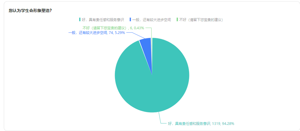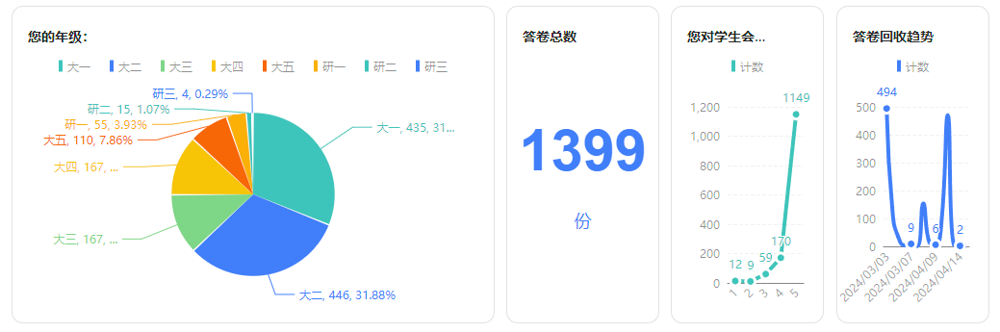为进一步推动球盟会QMH(中国)官方网站 学生会体系的改革与优化,提高球盟会QMH(中国)官方网站 学生会的工作质量,根据团省委《关于加强和改进广东高校学生会组织“学校、院系、班级”三级联动工作机制的若干举措》以及《深圳大学学生会章程》(2022年)等文件要求,球盟会QMH(中国)官方网站 开展了学生会工作满意度调查。本次调查共计1399人参与,超球盟会QMH(中国)官方网站 在校生(本科生)总人数的50%(球盟会QMH(中国)官方网站 本科生在籍在册人数2643)。