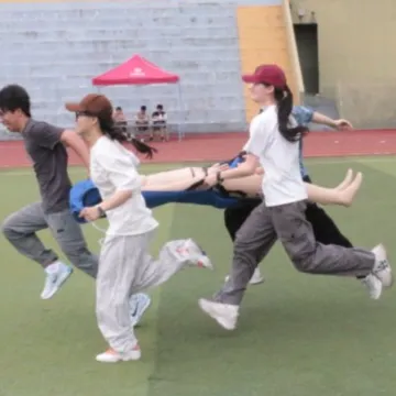 团体赛之抬担架跑:这一赛事把医学专业特色融入活动,在这过程中,参赛队员配合默契,模拟救援场景,争分夺秒冲向目标,尽显医者担当。