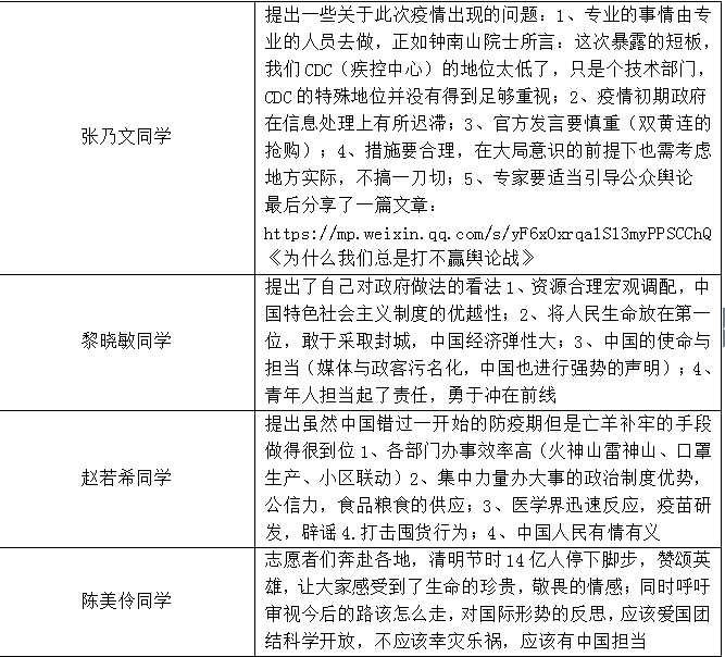 每位同学都结合本学期两次理论课就中国在本次疫情期间发挥的国家制度优势、采取的政策措施分享自己的想法感悟。