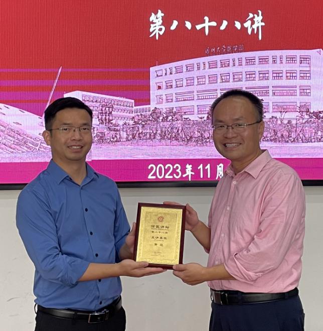 程君副教授为黄昆教授颁发深医讲坛荣誉奖牌