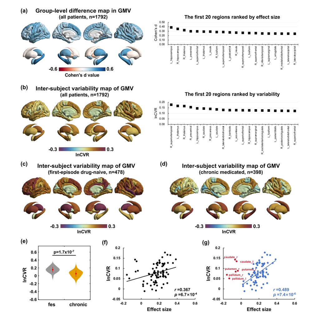 图. 病例组与对照组脑灰质测量的平均体积和变异的组间差异。图a:平均体积。图b-d:精神分裂症组、首次发病亚组和慢性亚组的变异性。图e:首次发病亚组和慢性亚组差异。图f-g:平均体积和变异的相关性。