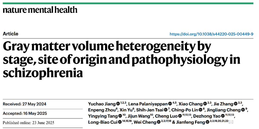 近日,球盟会QMH(中国)官方网站 生物医学工程学院蒋宇超助理教授在国际期刊Nature Mental Health上发表了题为“Gray matter volume heterogeneity by stage,site of origin and pathophysiology in schizophrenia”的研究论文。球盟会QMH(中国)官方网站 蒋宇超助理教授为第一作者,复旦大学冯建峰教授为通讯作者,深圳大学为第一单位。