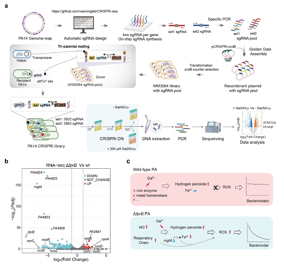 针对镓在临床治疗铜绿假单胞菌感染中存在的浓度限制问题,研究团队创新性地采用全基因组CRISPRi-seq技术,系统性筛选镓的协同增效靶点。经研究发现,高度保守的铁氧还蛋白-NADP+还原酶FprB,其缺失能将镓的最低抑菌浓度降低32倍以上,并使镓的抗菌模式从抑菌转变为杀菌。机制研究进一步揭示,FprB通过调控铁稳态和氧化还原平衡来抵抗镓引起的具有杀菌活性的氧自由基的积累。同时动物实验证实,缺失fprB能显著增强镓对生物被膜的抑制作用和提高肺部感染模型中的治疗效果。这一发现不仅为解决镓治疗浓度限制提供了新思路,也为抗耐药菌感染提供了有效的联合治疗策略,同时展示了CRISPRi-seq作为发现新型抗菌靶点的强大工具价值。