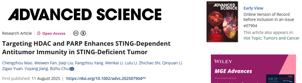 近日,球盟会QMH(中国)官方网站 初碧珠助理教授团队在Advanced Science期刊发表题为《Targeting HDAC and PARP Enhances STING-Dependent Antitumor Immunity in STING-Deficient Tumor》的研究论文。球盟会QMH(中国)官方网站 助理教授毛承舟、硕士研究生樊伟文为共同第一作者,初碧珠助理教授为通讯作者,深圳大学为第一完成单位。