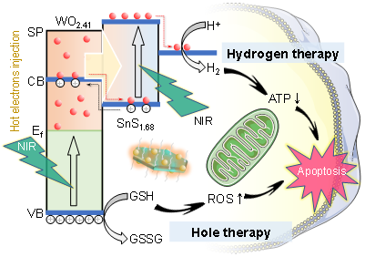 近年来,光催化水解产气提供了一种新兴的气体控释途径,但近红外(NIR)光催化产氢材料的开发遇到较大挑战,因为需要同时满足窄的带宽(≤1.53 eV for 808 nm light)和高的氧化还原活性,而且产气量受制于牺牲剂的有限担载量。针对这两大难题,何前军教授团队在SnS1.68纳米片(带宽 1.49 eV)表面铆接WO2.41纳米点构建了一种Z型结构SnS1.68-WO2.41纳米催化剂(如图所示)。WO2.41纳米点通过表面等离子体效应将热电子注入到SnS1.68纳米片中,实现NIR光催化产氢的同时增强了体系的氧化能力,从而能够利用肿瘤内过度表达的GSH作为牺牲剂实现肿瘤内NIR光催化产氢。产生的氢气和GSH的剥夺协同抑制了肿瘤中癌细胞的繁殖并诱导其凋亡,导致过度生长的肿瘤血管退化,并大量减少了肿瘤相关巨噬细胞含量(清除肿瘤免疫抑制),从而有效地破坏了癌细胞赖以生存的肿瘤微环境,达到了较好的肿瘤治疗效果。