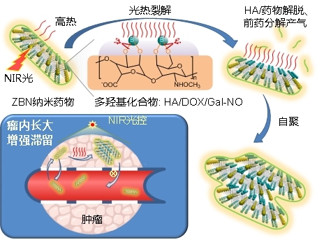 在纳米生物医药领域,提高纳米药物的靶向递送效率和实现精准可控的药物释放,是亟待解决的两个关键科学问题。类似地,NO/CO/H2S/SO2等毒气作为一类特殊的抗癌药物分子,如何增强其肿瘤靶向递送效率,在保证传输途中不漏气的情况下,还能实现肿瘤部位可控的放气,是纳米气体治疗领域面临的关键科学问题。近日,球盟会QMH(中国)官方网站 何前军教授带领的“先进纳米药物课题组”提出了一种近红外(NIR)光控聚集增强瘤内蓄积的新策略,通过设计合成透明质酸修饰的硼化锆二维纳米片(ZBN-HA),有效增强了纳米气体药物的瘤内蓄积和瘤内可控气体释放,增强了抗癌效果。