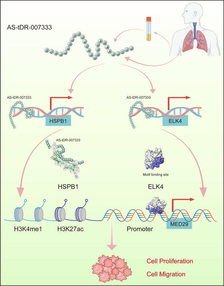 tRNA衍生片段(tRFs,tRNA-derived fragment)是一类新型小非编码RNAs(sncRNAs)分子,由成熟或前体tRNAs的特异性切割产生。该研究通过对非小细胞肺癌(NSCLC)病人术前/术后血浆进行tRF测序分析发现了一种新的tRF(AS-tDR-007333)。AS-tDR-007333在NSCLC病人血浆、癌组织以及癌细胞中均表达上调,且其表达水平升高与NSCLC细胞的恶性表型以及NSCLC病人的不良预后有显著关联。机制研究发现AS-tDR-007333可通过激活HSPB1介导的组蛋白甲基化以及ELK4介导的转录调控双重机制上调致癌基因MED29的表达,从而促进NSCLC细胞恶性生长。该研究还进一步在体内外实验中证明了敲低AS-tDR-007333可抑制NSCLC细胞的生长。本研究揭示了tRF在NSCLC发病机制中的重要性及新机制,提示AS-tDR-007333可以作为NSCLC的一种新型诊断/预后生物标志物和新的治疗靶点。