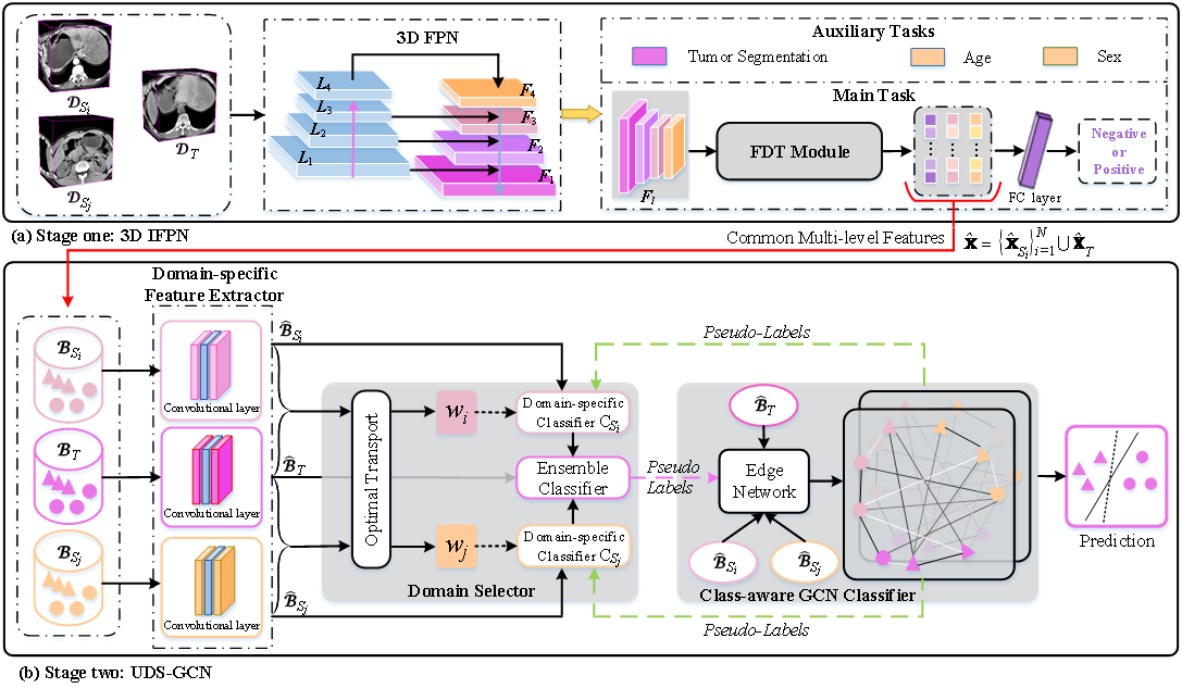 该研究提出了一种新颖的多源域自适应框架,该框架不仅提取了域不变和域特定特征,而且实现了跨域的不均衡知识转移和类感知特征对齐。首先,该研究开发了一个改进的特征金字塔网络从高分辨率3D CT图像中提取公共的多级特征,其中被提出的特征动态迁移模块用以提高网络识别小目标(即淋巴结)的能力。然后,该研究设计了一个无监督域选择图卷积网络,它主要包括三种类型的组件:域特定特征提取器、域选择器和类感知图卷积分类器。具体来说,多个域特定特征提取器用于从改进的特征金字塔网络生成的公共多级特征中学习域特定特征。域选择器利用最优传输理论旨在控制从源域传输到目标域的知识量。类感知图卷积分类器被提出以显式地增强/削弱跨域所有样本对的类内/类间相似性。为了优化无监督域选择图卷积网络,域选择器和类感知图卷积分类器通过协作学习的方式在迭代过程中相互提供可靠的目标伪标签。广泛的实验是在从四个医疗中心收集的内部CT 图像数据集上进行的,且所提出的方法在实验设定的四个任务中分别完成了84.31%、65.45%、76.92%和75.68%的准确率,均优于经典的机器学习方法和最先进的迁移学习方法。