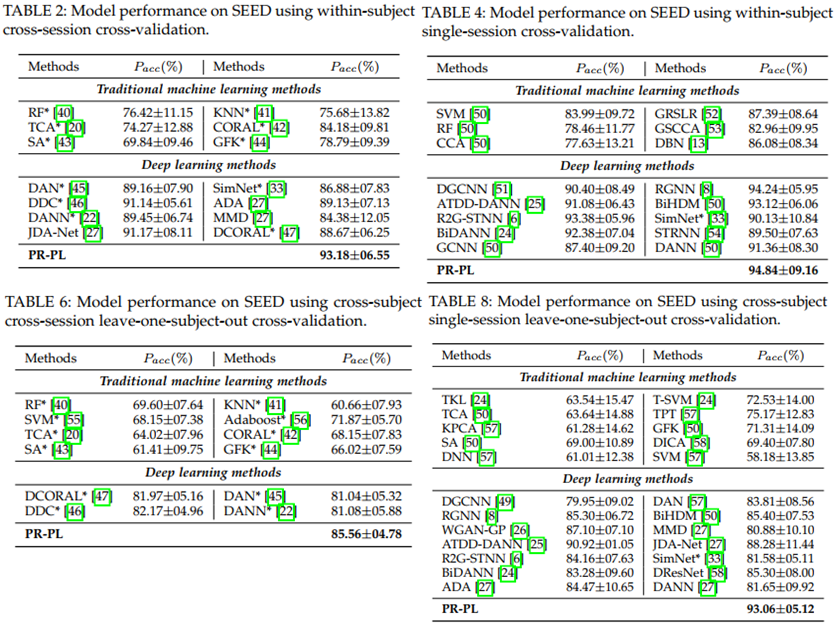 PR-PL的模型架构设计如图一所示。(1)结合原型特征学习(Prototypical Learning)和DANN网络,寻找普适、共享、信噪比高的情绪原型特征。通过双线性变换揭示样本特征与原型特征之间的关系,并将其映射到分类空间,实现情绪分类。这种方法在减少脑电信号个体差异的同时,也有效减轻了DANN网络容易受到噪声干扰的问题。(2)发展配对学习方法,利用配对标签来评估两个脑电信号是否属于相同类别。因此,配对学习的训练过程无需依赖精确的标签信息,却能达到与样本分类学习相媲美甚至更优的性能。对于有标签信息的源域数据,团队提出有监督配对学习(Supervised Pairwise Learning)来取代传统的样本分类学习。这个方法有效缓解了DANN网络对于源域精确标签依赖性和易受标签噪声干扰的问题。(3)对于无标签信息的目标域数据,团队提出无监督配对学习(Unsupervised Pairwise Learning)和动态置信度阈值算法,以解决DANN网络仅关注源域数据可分性而导致过拟合的问题。由于目标域缺乏标签信息,团队提出利用动态变化的阈值来筛选置信度高的配对样本,并赋予伪标签(Pseudo Label)用于训练。通过无监督配对学习,推动模型关注目标域数据的可分性,提升其在目标域的泛化性能。