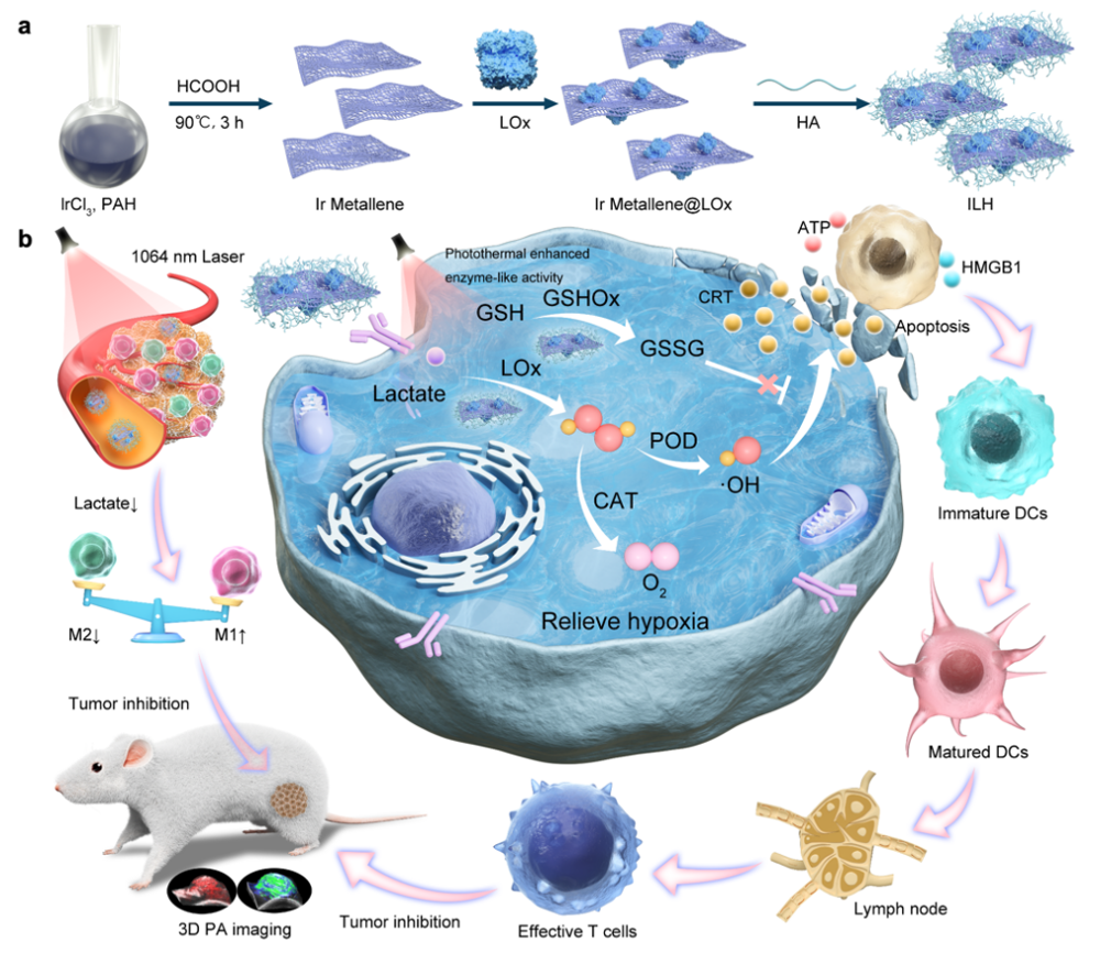 面对乳酸堆积引起的肿瘤免疫抑制微环境,大量的研究集中在开发抑制剂(例如乳酸脱氢酶抑制剂司他克林)来降低肿瘤内的乳酸水平,但由于抑制剂无选择性,通常会同时影响正常健康细胞的新陈代谢,导致严重的毒副作用。因此,开发一种安全有效的乳酸调控策略成为新的挑战。本研究设计了一个具有调节免疫抑制肿瘤微环境功能的双酶驱动级联反应平台(ILH),用于光声成像引导下的肿瘤催化治疗和免疫激活。铱纳米酶与乳酸氧化酶(LOx)的协同作用不仅能够高效消耗乳酸,促使肿瘤相关巨噬细胞从M2型向M1型表型转化,从而改善免疫抑制性肿瘤微环境;同时,该平台能够缓解肿瘤缺氧,诱导强烈的氧化应激反应,进而引发免疫原性细胞死亡,激活体内抗肿瘤免疫。此外,铱纳米酶的光热性能可以进一步增强级联催化反应的效果。通过监测内源性分子的光声信号变化,利用三维多光谱光声成像技术,可以实现体内级联催化治疗过程的实时监控。本研究通过构建双酶级联反应器,为调节免疫抑制性肿瘤微环境和免疫激活提供了新的策略。
