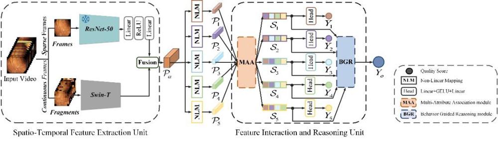 本研究构建了首个多属性视觉感知标注的结肠镜视频质量评估数据集,包含1000个具有真实失真的结肠镜视频,从时空可视性、亮度、镜面反射、稳定性和实用性五个失真属性及整体质量进行标注,为VQA研究提供了基础支持。此外,本研究提出了创新的无参考视频质量评价方法DARNet。如图所示,DARNet的网络框架由STFE单元和FIR元组成。STFE单元包含两个用于提取空间和时间质量失真特征的流,而FIR单元则由MAA模块和BGR模块构成。MAA模块能够自适应地聚合提取的特征,并预测每个失真属性的质量分数;BGR模块则根据被试对失真属性相关性的反馈,在属性感知特征之间进行交互推理,从而得出整体质量分数。