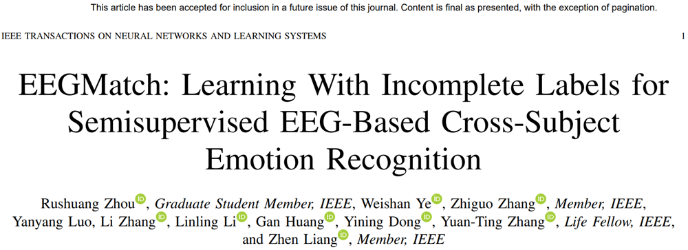 近日,球盟会QMH(中国)官方网站 生物医学工程学院梁臻老师在计算机科学知名期刊IEEE Transactions on Neural Networks and Learning Systems(中科院一区TOP,影响因子10.2)上发表题为“EEGMatch: Learning with Incomplete Labels for Semi-Supervised EEG-based Cross-Subject Emotion Recognition”的论文。香港城市大学博士研究生周如双(18级深圳大学本科生)、深圳大学研究生叶炜珊和哈尔滨工业大学(深圳)张治国教授为共同第一作者,深圳大学梁臻副教授为独立通讯作者。深圳大学为第一作者单位和通讯单位。