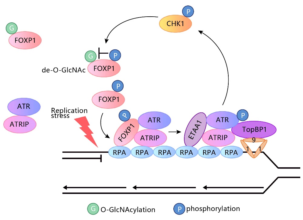 基因组DNA在复制过程中受到多种内源和外源压力的干扰,导致复制叉的减缓或停滞。高效的DNA复制压力应答机制可确保基因组信息的精准复制,ATR信号通路在其中发挥重要作用。ATR作为复制压力感知和应答通路中的关键激酶,通过催化一系列底物蛋白的磷酸化调控多种应答机制以维持基因组的稳定性,包括稳定和重启阻滞复制叉,抑制复制起始,维持dNTP水平以及激活细胞周期检验点等。ATR通路缺陷可以引发细胞功能受损甚至细胞死亡,并在个体水平导致发育异常和肿瘤发生。该项研究鉴定了新的ATR激活调控蛋白FOXP1。FOXP1通过与RPA-ssDNA直接结合募集到阻滞复制叉,并通过蛋白间直接互作促进ATR到染色质的募集以及ATR-CHK1通路的活化。其中FOXP1的O-GlcNAc糖基化修饰抑制FOXP1与ATR的结合,而复制压力下CHK1介导的FOXP1磷酸化修饰拮抗其糖基化修饰,形成ATR-CHK1活化的正反馈调控通路 (工作模式图如下所示)。FOXP1的致病突变体导致ATR-CHK1活化的缺陷以及阻滞复制叉的不稳定,该现象部分解释了FOXP1缺陷导致发育异常和肿瘤发生的致病机制。这是许兴智教授团队继发现先天性小头畸形致病基因编码的ASPM蛋白(PNAS 2022)和多聚(ADP)核糖聚合酶PARP1的UFM1修饰(PNAS 2024)促进ATR-CHK1活化之后的又一新的调控机制。