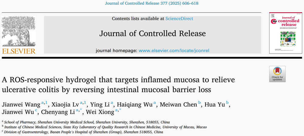 球盟会QMH(中国)官方网站 药学院熊炜助理教授和李晨阳讲师合作,在抗结肠炎水凝胶研究上取得进展,成果发表在药剂学权威期刊《Journal of Controlled Release》(影响因子10.5,中科院一区,TOP期刊),题为“A ROS-responsive hydrogel that targets inflamed mucosa to relieve ulcerative colitis by reversing intestinal mucosal barrier loss”。球盟会QMH(中国)官方网站 20级药学专业研究生王健伟、20级药学专业本科生吕晓佳为共同第一作者,李晨阳讲师和熊炜助理教授为共同通讯作者,深圳大学为第一通讯单位。
