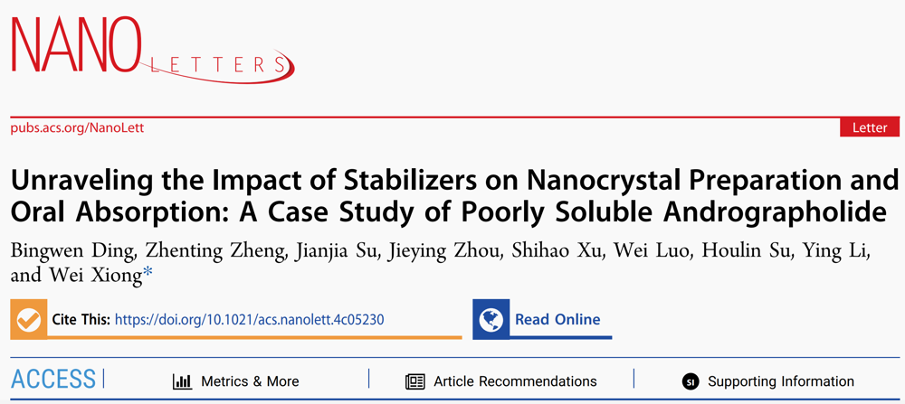 球盟会QMH(中国)官方网站 药学院熊炜老师在药物纳米晶的稳定机制研究取得进展,成果发表在自然指数期刊《Nano Letters》(影响因子9.6,中科院一区),标题为“Unraveling the Impact of Stabilizers on Nanocrystal Preparation and Oral Absorption: A Case Study of Poorly Soluble Andrographolide”。球盟会QMH(中国)官方网站 药学院19级药学专业本科生丁炳文和郑震庭为第一作者,熊炜助理教授为独立通讯作者,深圳大学为第一通讯单位。