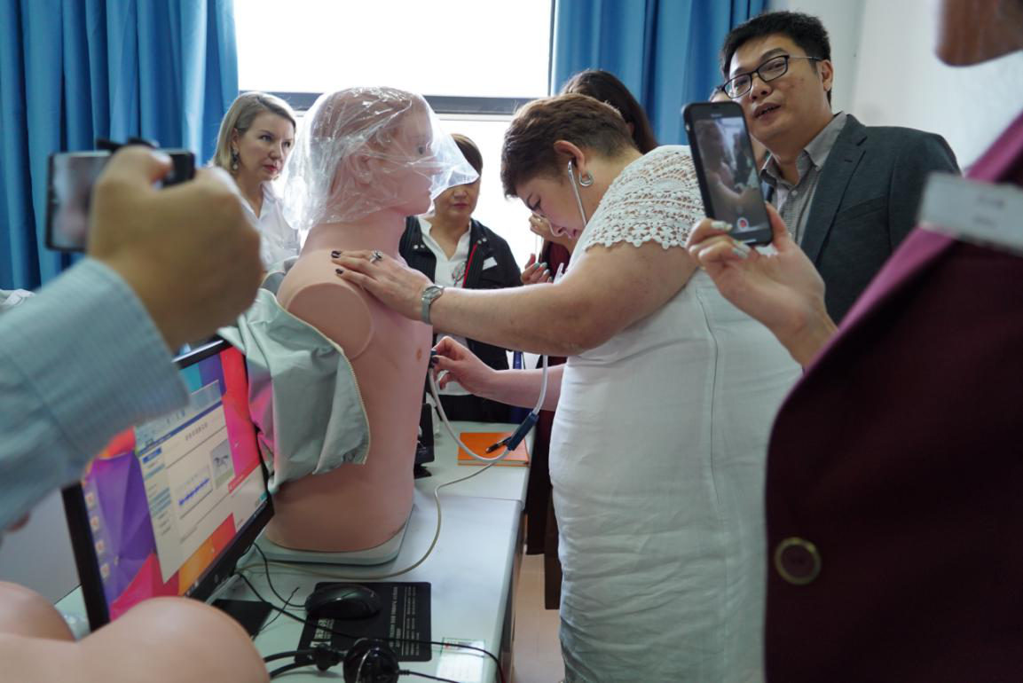 来宾还对临床技能中心的核心教室进行了参观。在我校专业老师的指导下,对医疗教学模型进行了操作。我校师生的专业知识和技能赢得了哈方代表团的高度好评和一致赞誉。