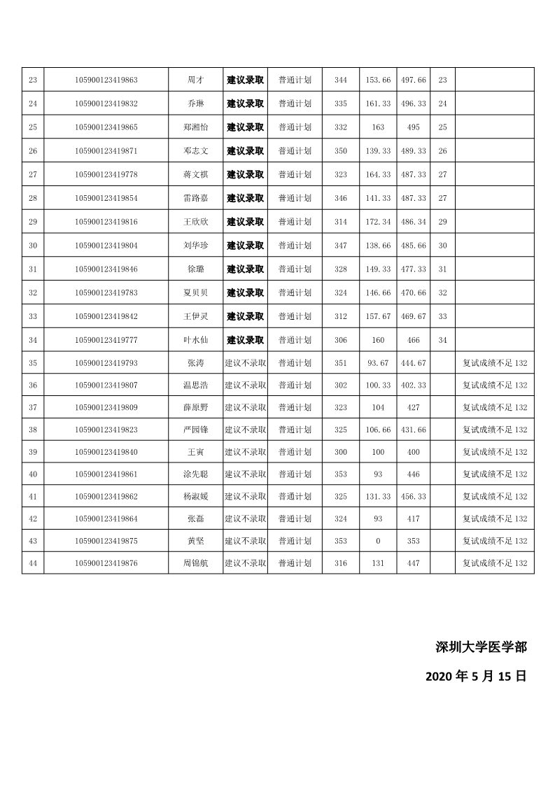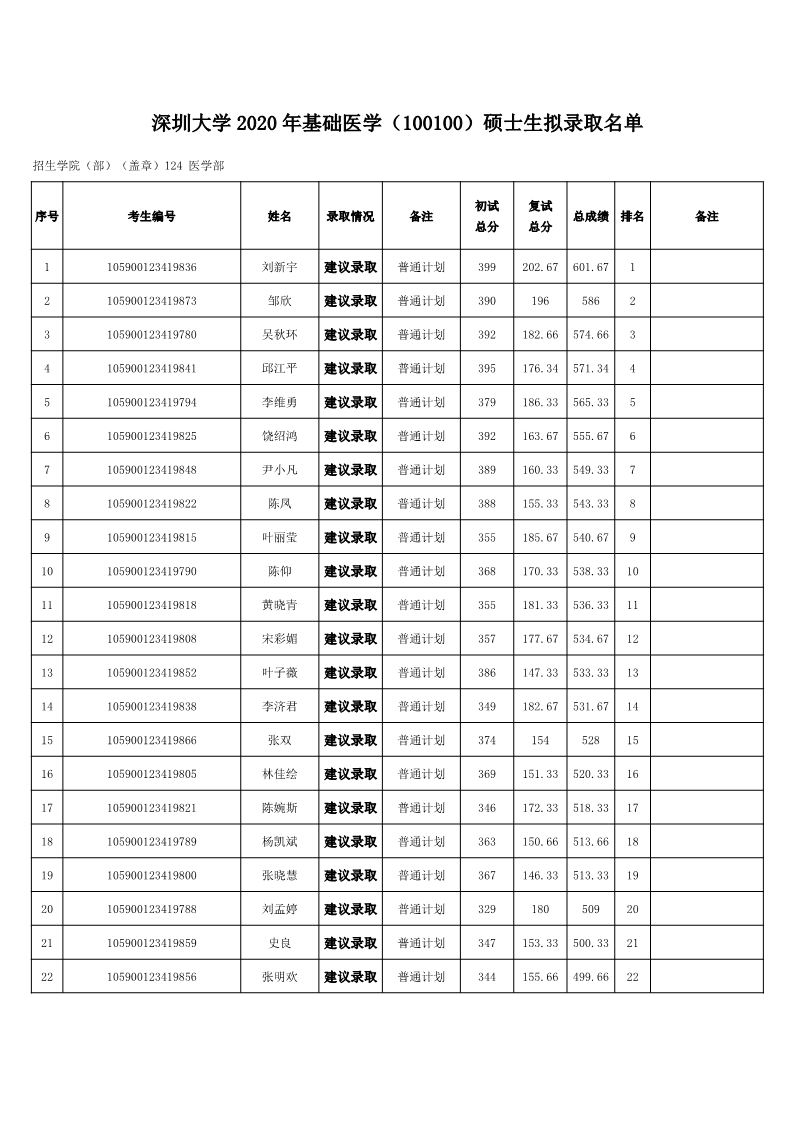 深圳大学 2020 年基础医学(100100)硕士生拟录取名单