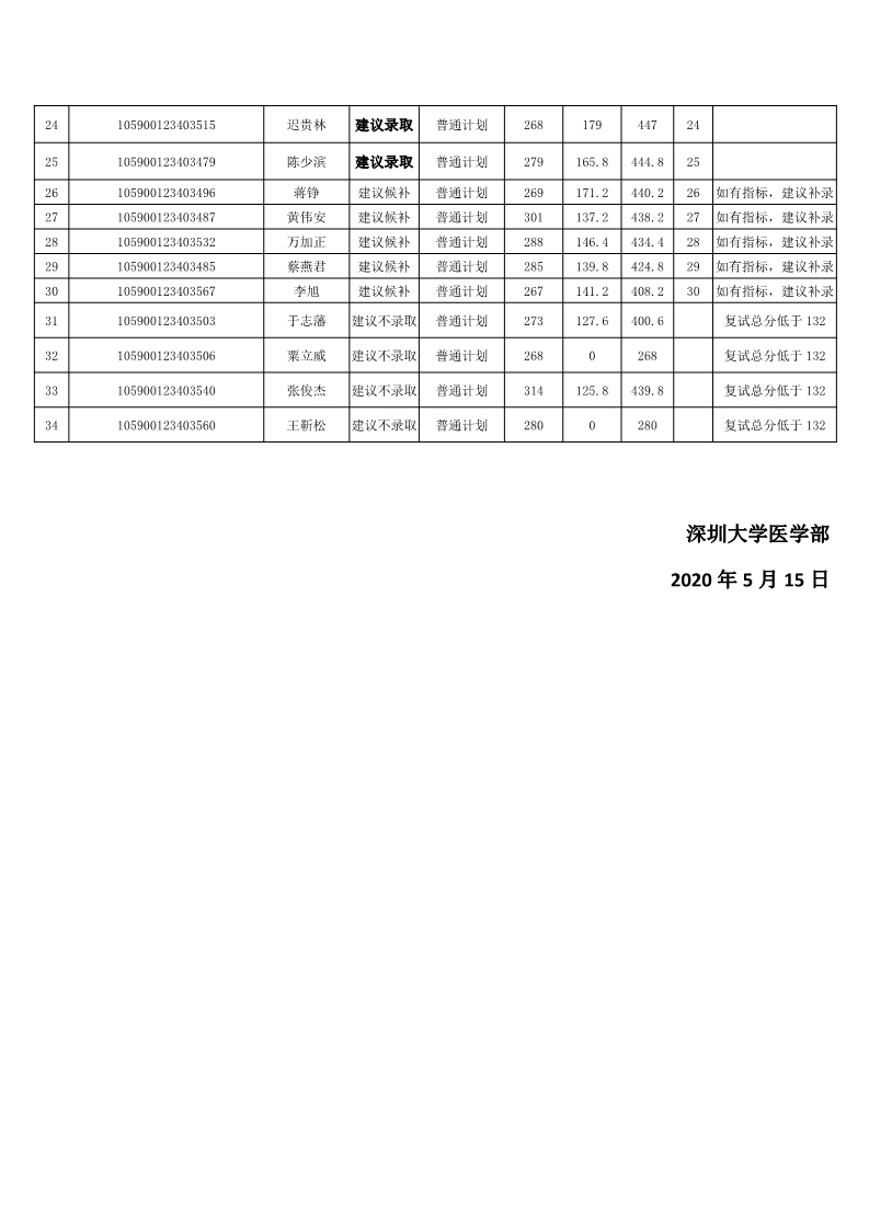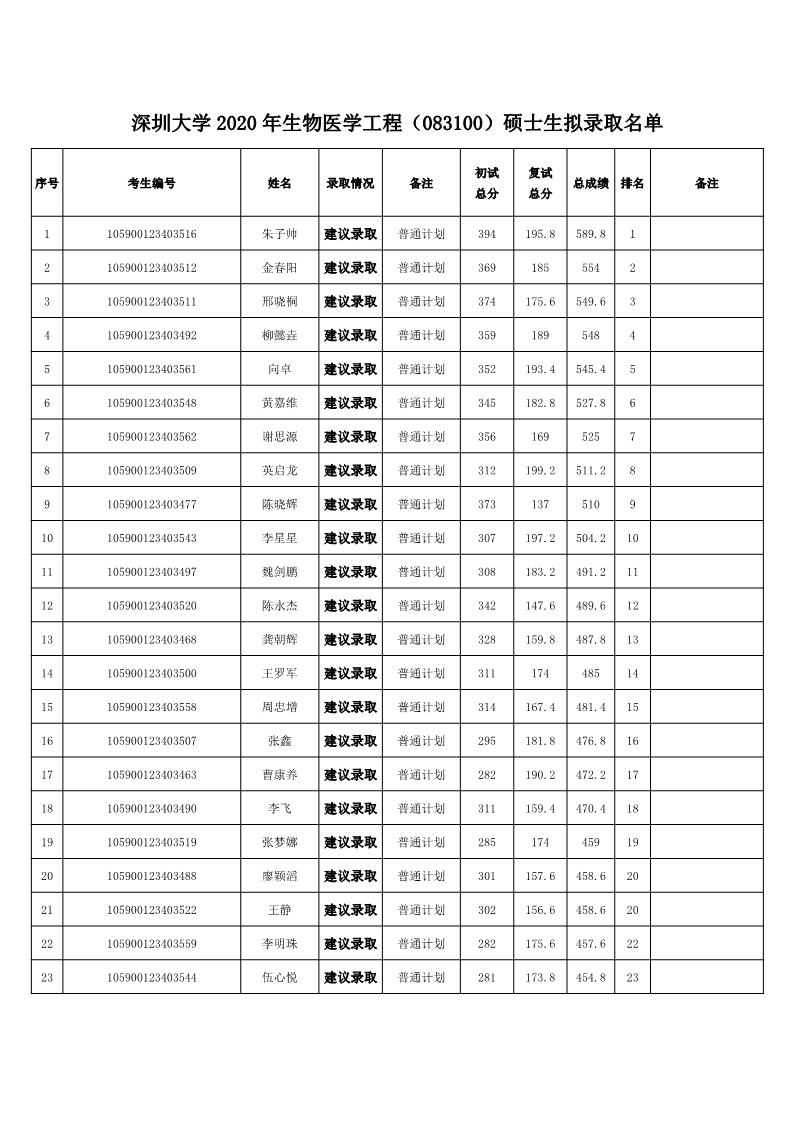 深圳大学 2020 年生物医学工程(083100)硕士生拟录取名单