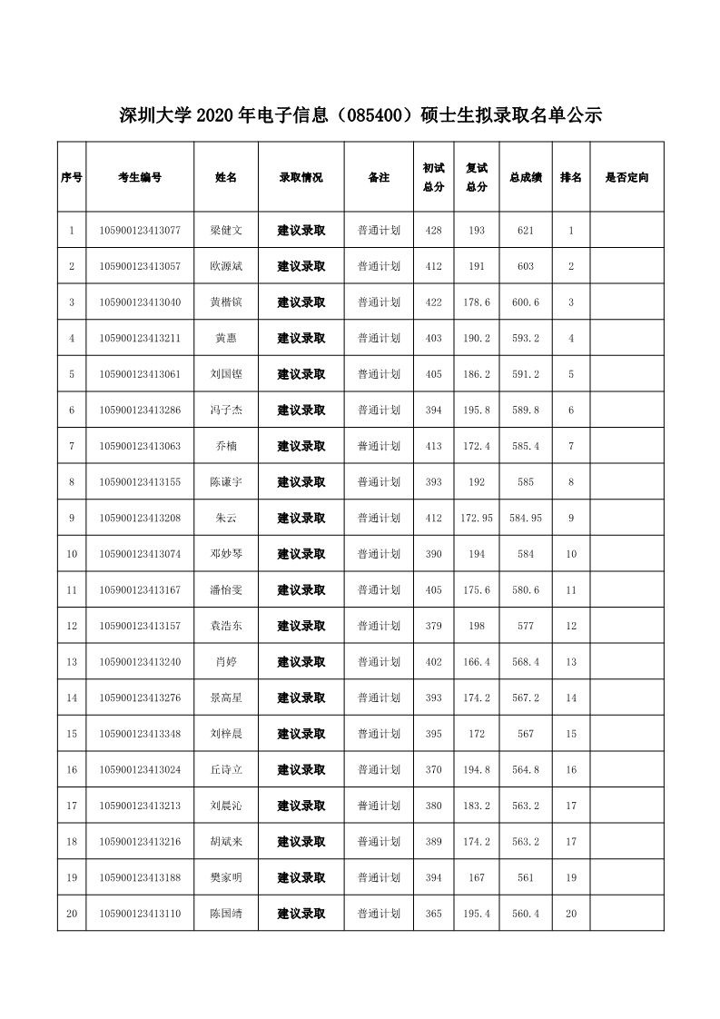深圳大学 2020 年电子信息(085400)硕士生拟录取名单公示