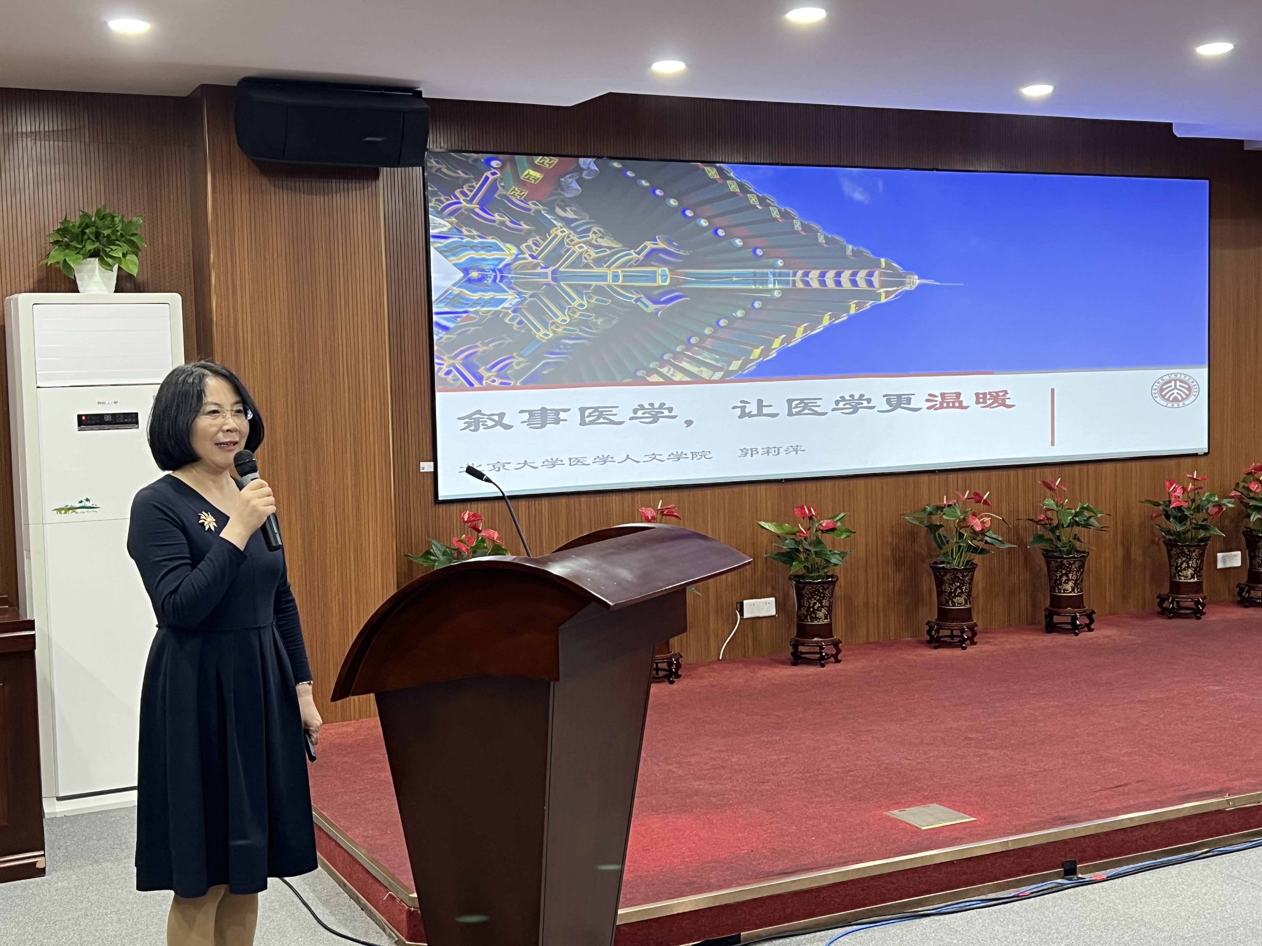 郭莉萍进行了主题发言。她以“叙事医学基本概念及课程设置”为题,详细介绍了何为叙事医学、如何开展叙事医学教育两个主要问题。她综合叙事医学的原理和进展,提出了“小红花模型”,深入浅出地展示了何为叙事医学、叙事医学的特点、如何培养叙事能力、如何实践叙事医学以及叙事医学的目标——构建高信任度的医疗—社会关系。接下来,她详细介绍了小红花模型的应用,即如何将叙事医学的理念运用于问诊、指导医患关系的建立、帮助医患共同决策等方面;她还就叙事医学课程设置和思政要点进行了仔细的介绍。精彩的报告得到了全场高度的共鸣和热烈的掌声。