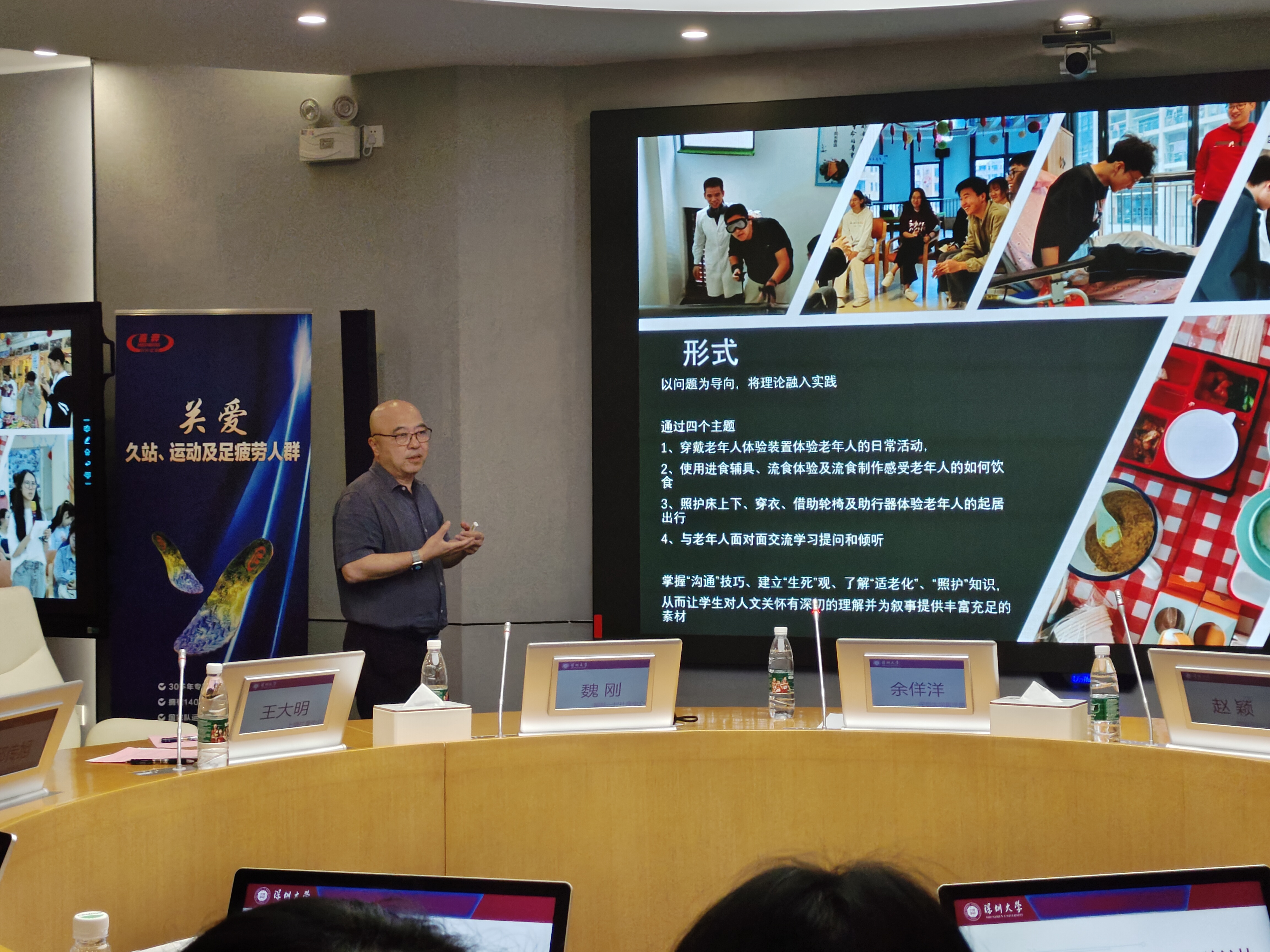 接下来,余佯洋介绍了广东省一流本科社会实践课程《温暖的医学》的建设和开展情况。她仔细介绍了课程目标、内容设置、实践流程和考核方式,并通过精彩的案例给来宾们展示了同学们的学习实践、思考和收获。《温暖的医学》围绕叙事医学展开设计,践行“生命全周期,健康全过程”的医学发展理念,将思想政治教育、医学人文素质教育和医学专业教育充分融合,通过构建“生·老·病·死”全生命周期的二阶段社会实践,实现以学生为中心的教学,旨在培养具有叙事素养和叙事能力,能够共情和回应患者疾痛故事的新一代医者。