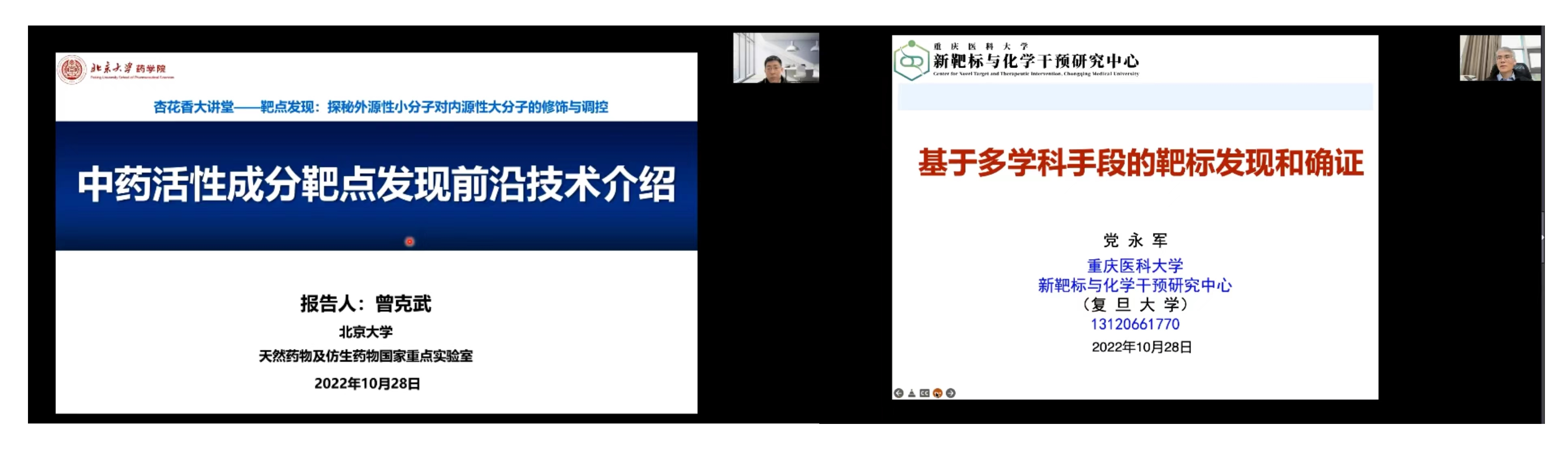 2022年10月28日上午9点至11点40分,由深圳大学中医药守正创新研究院联合球盟会QMH(中国)官方网站 药学院创办的第一期“杏花香大讲堂”学术论坛以线上会议形式成功举办。本次论坛由深圳大学中医药守正创新研究院院长、球盟会QMH(中国)官方网站 药学院院长程永现特聘教授主持,北京大学药学院曾克武教授、重庆医科大学党永军教授围绕“靶点发现:探秘外源性小分子对内源性大分子的修饰与调控”主题,分别做了精彩分享。据统计,547名来自全国科研院所及高校的科研人员和学生在线参加了会议。