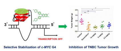 三阴性乳腺癌是一类恶性程度很高的乳腺癌,因其缺乏有效药物靶点,传统的靶向疗法均对其没有效果。目前,化疗仍然是首选的治疗方法,但是化疗副作用大,而且往往可以导致肿瘤耐药。因此,寻找新型三阴性乳腺癌治疗策略意义重大。众多研究表明,三阴性乳腺癌中原癌基因c-MYC高度表达,是促进肿瘤生长、转移以及耐药的重要因素,因此,下调c-MYC表达将能够有效抑制三阴性乳腺癌。此研究基于喹喔啉骨架结构,设计并合成了一系列靶向c-MYC启动子区G-四链体结构的小分子化合物。进一步研究表明,双氟取代的类药小分子QN-1可以选择性地结合并稳定c-MYC G-四链体结构,从而特异性下调癌细胞c-MYC的表达,进而抑制癌细胞的增殖和转移。该化合物治疗效果优于化疗药物多柔比星、紫杉醇等,且毒副作用较低。此研究首次报道了G-四链体小分子配体在三阴性乳腺癌治疗中的应用,提示可以通过发展特异性靶向c-MYC G-四链体的小分子化合物来有效治疗三阴性乳腺癌。此研究为三阴性乳腺癌的化学治疗提供新视角。