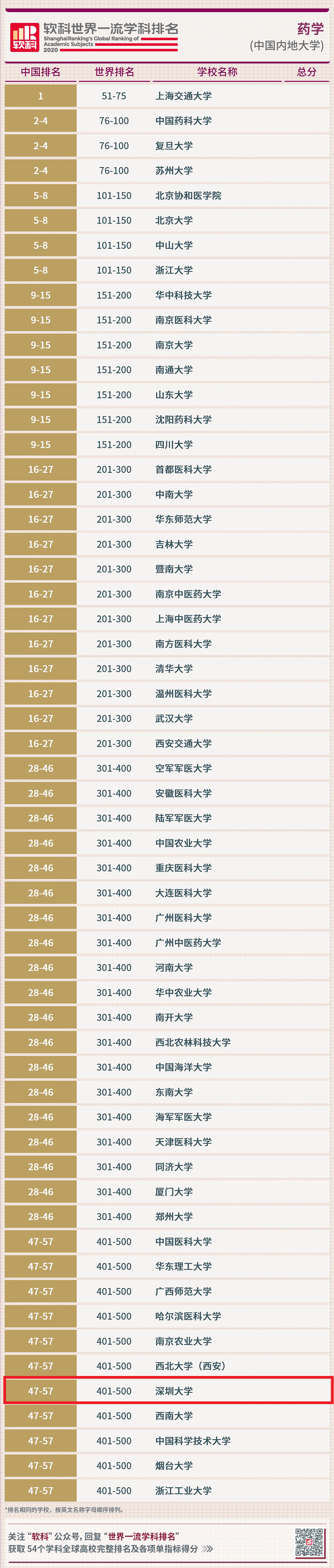 深圳大学药学专业在开设的仅仅7年,药学院成立2年之际,即入榜药学学科软科排名,取得重大突破:在国内药学学科排名47-57,在国际药学学科排名401-500。