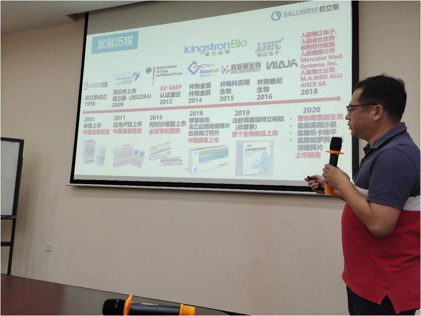 两位经理以PPT的形式再次向同学们介绍了公司的一些详细情况,包括行业地位、发展历程、企业荣誉等。从仿制药到创新药的艰辛历程,到逐渐加快的科研速度,以及对亚裔患者的关怀,和通过实验改变业界对于用药理解的做法,这一切给在场的同学们留下了深刻印象。展示完毕之后,信立泰的经理再次强调了他们公司核心的理念:“美好源于诚信”,并鼓励在场的大家坚持走下去,为药学领域开辟更广阔的天空。
