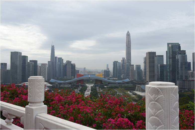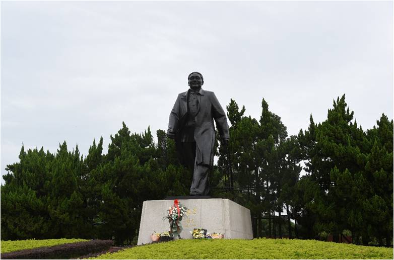 经历了十数分钟的攀登历程后,大家成功登顶。此时细雨已停,乌云渐开,明亮的日光从云层上洒下,映照着桃花山下接连矗立的城市建筑群,向同学们呈现出深圳生姿勃发的气象。莲花山顶的邓小平同志铜像面带微笑,抬手迈脚,衣摆轻舞,似乎正要像36年前首次来深视察那样再次走入蓬勃向上的深圳去。登顶的游客们纷纷为此景所动容,拿出手机与宏伟壮观的建筑群合影,或是向邓小平同志的铜像送上鲜花。
