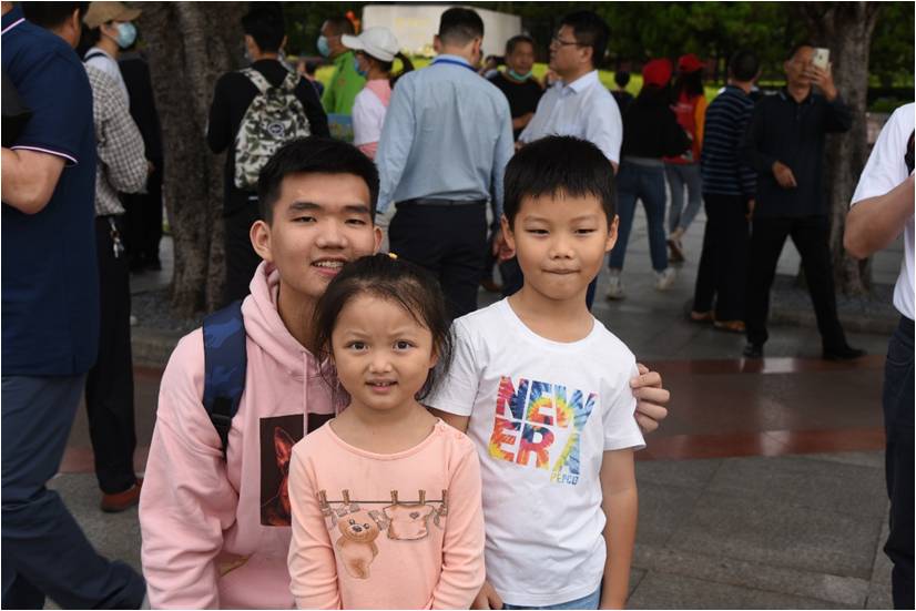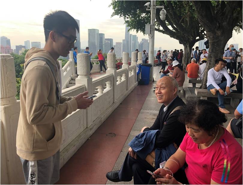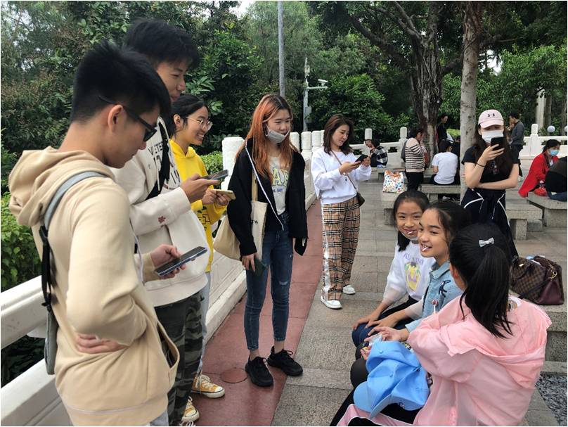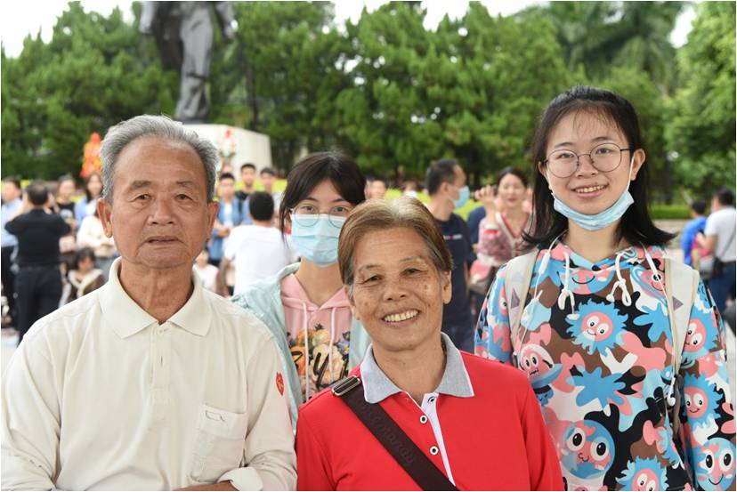 同学们趁此机会,迎上前去,友好、礼貌地向游客招呼,提出此前准备好的四个重要问题——您的青春关键词是什么?您青春与祖国的联系是什么?您对深圳的印象是什么?在这次随机即采访中,受访者的年龄、性别、生活情况都大不相同,但当被问及上述问题时,无一例外地露出了微笑:小朋友们天真灿烂地笑着,向采访的大哥哥大姐姐们细数着他们在深圳的快乐回忆;年轻人腼腆地笑着,不好意思地讲述着自己在深的工作计划,言行举止间满怀着对深圳的好奇和对未来的憧憬;老年人对镜头咧开嘴露出牙齿,谈及过去的苦涩和现在的幸福,乐得眯起双眼。看着受访者们用不同的神态表达着自己对青春、对深圳、对祖国的各种看法,同学们往往忍俊不禁,和受访者们交谈甚欢,采访完后还意犹未尽地请求和采访者共同合影,借此机会在这特殊的日子里,和有缘相逢的同胞一起在深圳留下青春的美好回忆。