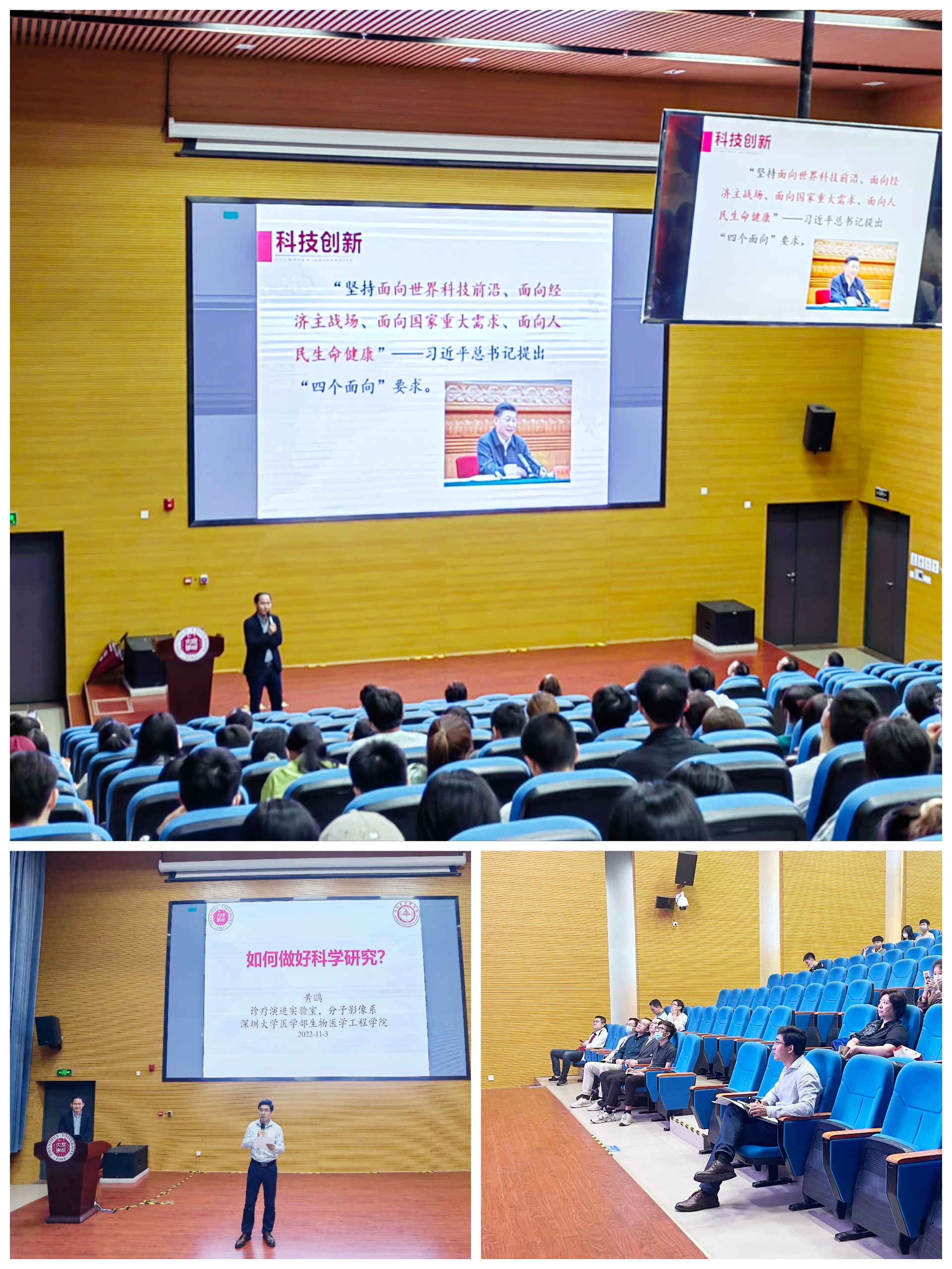 为进一步了解研究生科研需求,解决同学们在科学研究中存在的困难,增强同学们的科研意识,营造良好的科研氛围,充分调动开展科学研究的积极性和创造性,推动我院科研高质量可持续发展,药学院于2022年11月3日晚上19点30分在深圳大学丽湖校区A5报告厅举办了本学期师生座谈会。药学院十分重视本学期的师生座谈会工作,为此,药学院院长程永现教授特别邀请到了深圳大学球盟会QMH(中国)官方网站 生物医学工程学院黄鹏教授,请他专门给药学院的同学带来一份主题报告,与同学们分享科研感悟。本次座谈会由药学院李国锋老师主持,药学院副院长吴海强教授、药学专业硕士研究生导师及20级、21级、22级全体药学专业硕士研究生参加了本次座谈会。