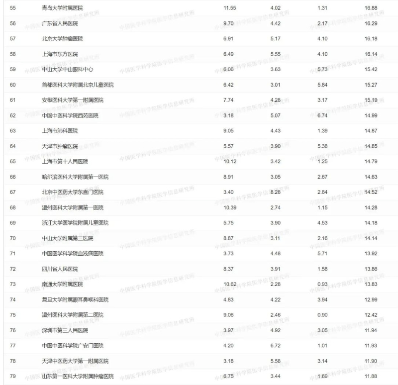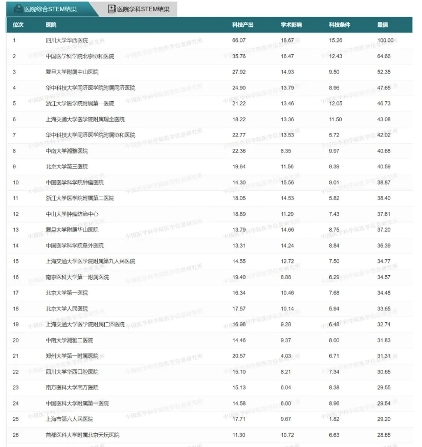 科技量值由中国医学科学院提出,是对评价对象的医学科学与技术水平与前沿性的多元立体评价矩阵,目前主要针对医院、医学院校等做出评价。排行榜对全国110所独立医学院校和设立医学学科的综合大学2021年度科技量值进行了测算,并覆盖了全国1641家三级医院,发布前100位的医院评价,评价结果分为两部分,一是综合科技量值;二是学科科技量值,涵盖心血管病学、呼吸病学等共31个临床医学二级学科及部分三级学科。