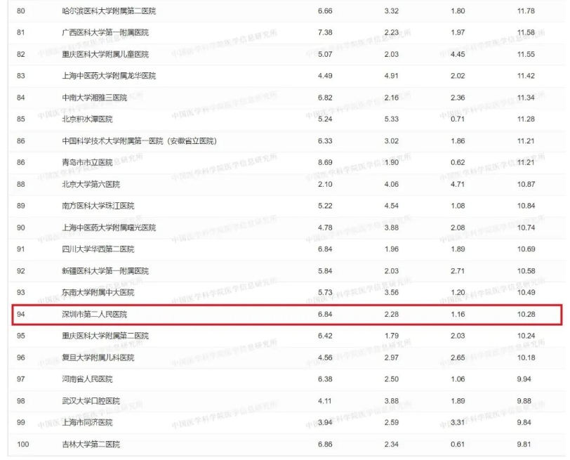 同时,我校直属附属医院中,深圳大学第一附属医院(深圳市第二人民医院)综合科技量值首次进入全国百强,位列94,是深圳市仅有的2所百强医院之一,标志着临床医学学科建设益显成效;且在学科榜单中有12个学科进入全国百强,其中,泌尿外科学排名12,耳鼻咽喉科学排名16,内分泌病学与代谢病学排名17,烧伤外科学排名23,神经外科学排名32,神经病学排名51,骨外科学排名53,重症医学排名72,肾脏病学排名72,风湿病学与自体免疫病学排名75,护理学排名75,肿瘤学排名89,排名整体提升显著。